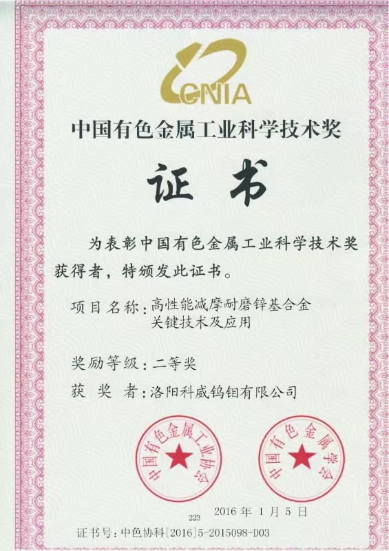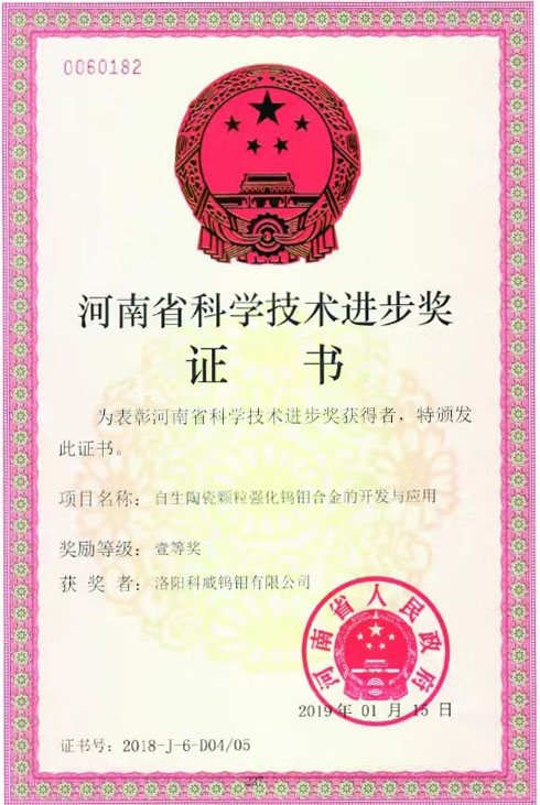 四、荣誉: “国家高新技术企业”, 国家专精特新重点“小巨人”企业, “国家科技型中小型企业”, “河南省钼及钼合金工程技术研究中心”, “有色金属省部共建协创中心理事单位”,“2025年河南省首批次新材料产品”,等。